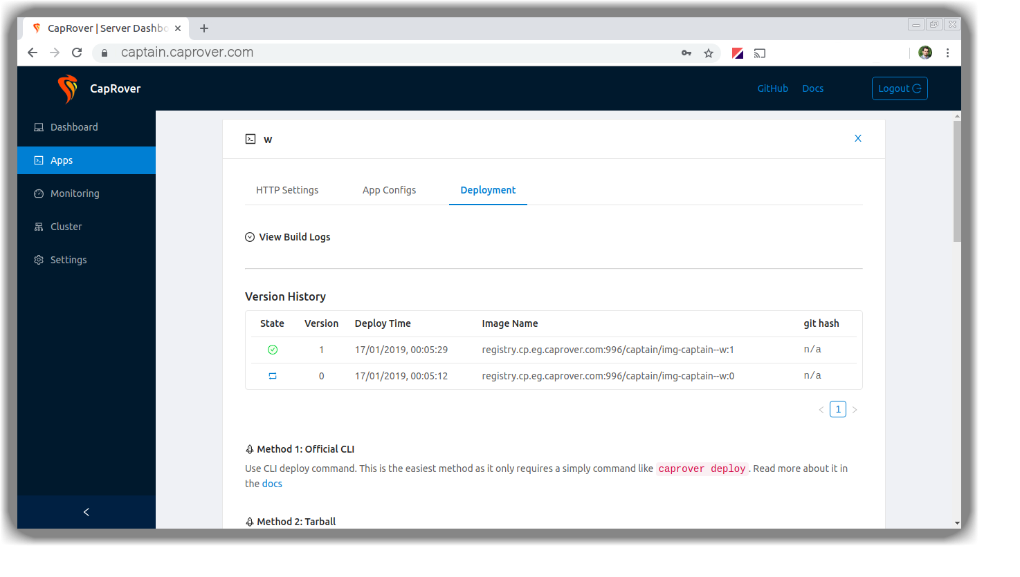 Many ways to deploy: upload your source from dashboard, use command line caprover deploy, use webhooks and build upon git push